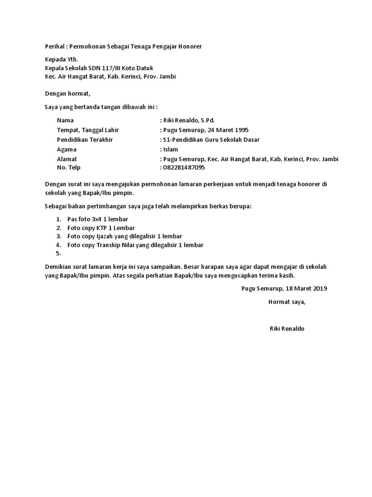 Menjadi guru honorer bisa dijadikan sebagai kegiatan sambil menunggu tes pegawai negeri sipil dan pengangkatan. Contoh surat lamaran menjadi guru tidak tetap. Sebab pasti, sebagai seorang manusia, kita sangat membutuhkan mata pencaharian untuk bertahan hidup. Contoh surat lamaran kerja guru terbaru dan terlengkap 2019. We hope you are enjoy and finally will get the best picture from our collection that uploaded here and also use for ideal needs for personal use.